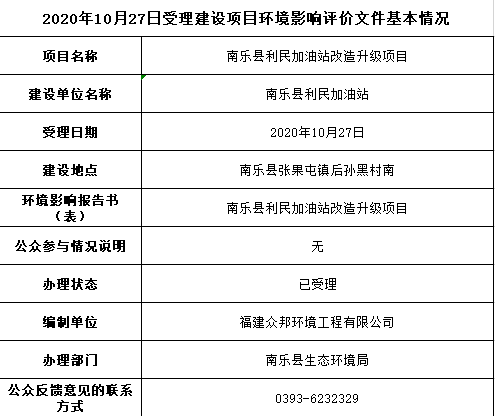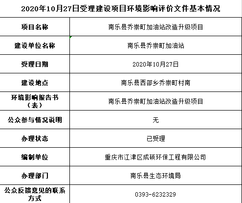2020年10月27日受理建設項目環境影響評價文件基本情況公示